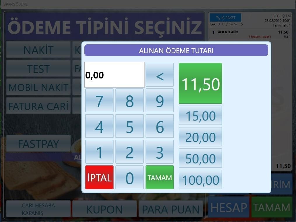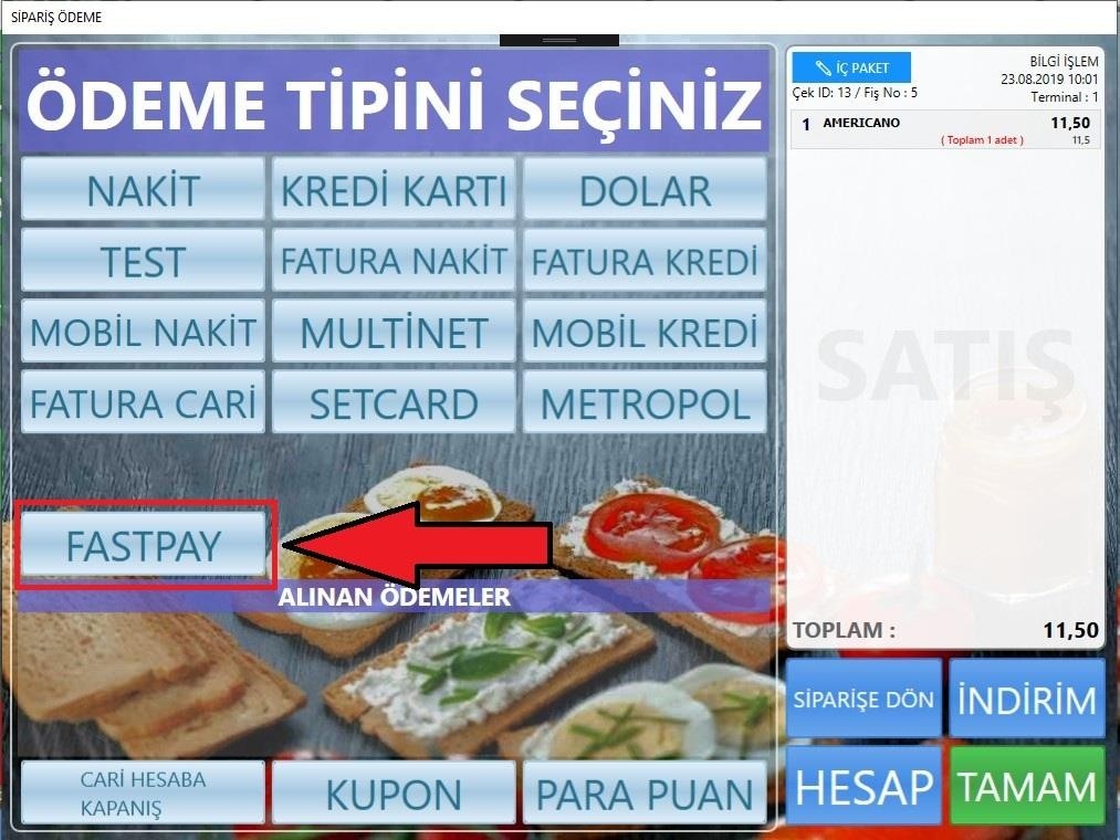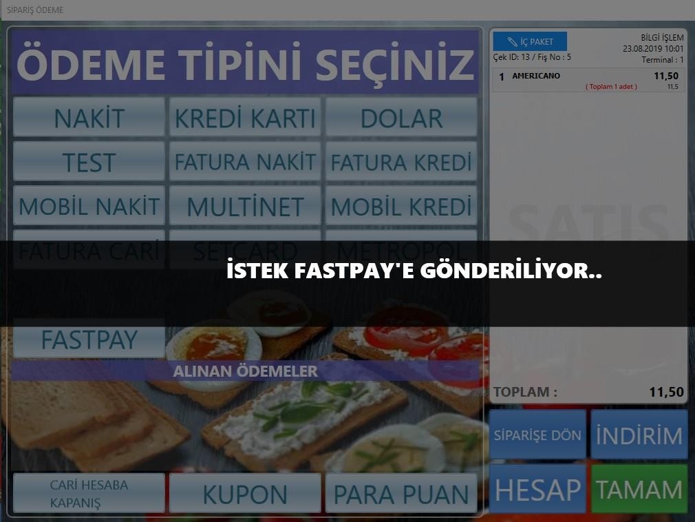 Çek kapat butonuna basıldıktan sonra ekrana gelen ekran üzerinden Fastpay ödeme tipi seçilir.