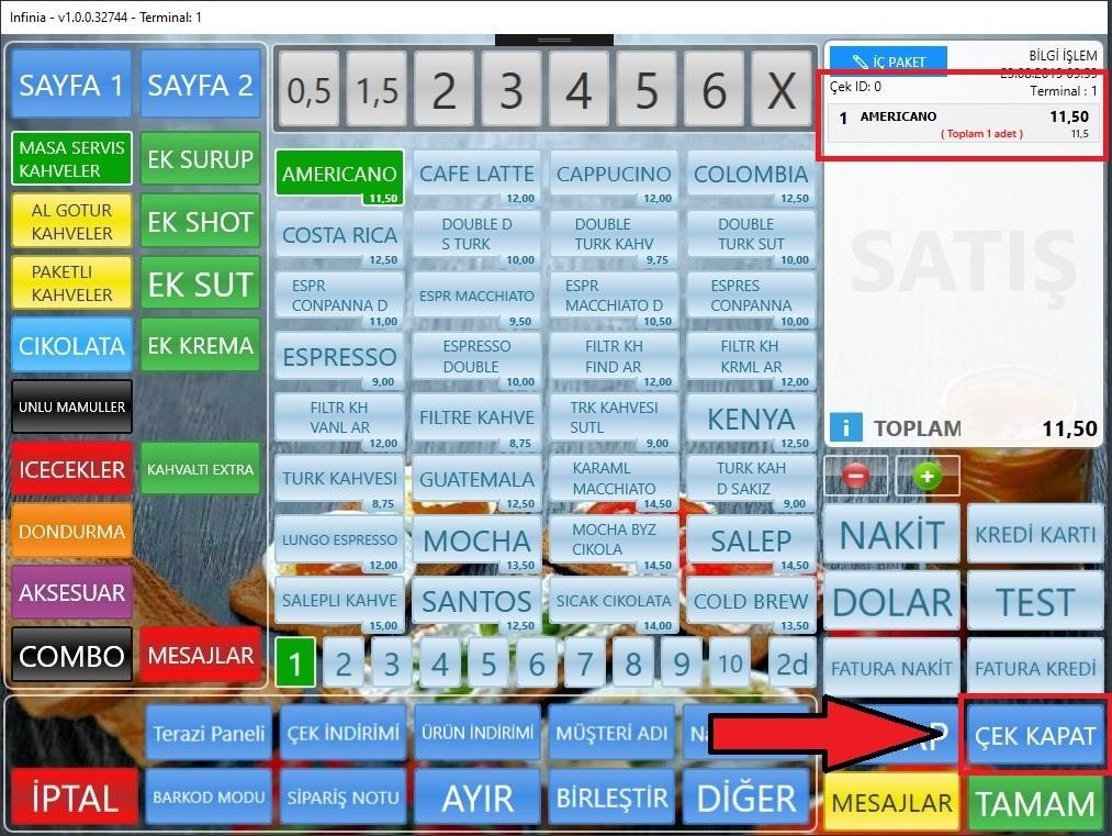 Fastpay ile ödeme yapılmak istenilen çek içerisinde ürün girişi yapılarak sağ alt kısımda bulunan çek kapat butonuna basılır.