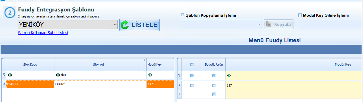 - Şubeye Fuudy şablonunun eşleşmiş şekilde aktarılabilmesi için Posfinans CPMV2 modülü üzerinden Fuudy şablonu seçilir ve “FUUDY” ürünü ile “117” keyi eşleştirilir;