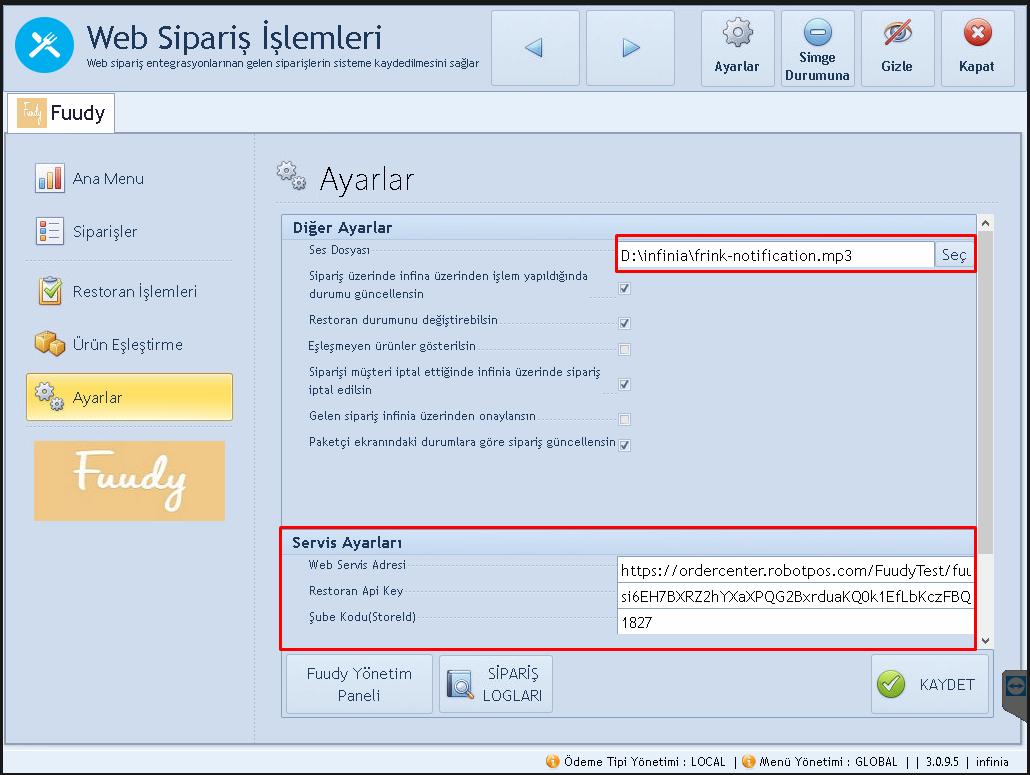 - Kurulumlar tamamlandıktan sonra infinia.WebOrder.Integrations uygulamamızın Fuudy bölümündeki ilgili alanlara Fuudy Paneli üzerinde entegrasyon bilgileri ve restoran ID alınarak işlenmeli ve sipariş geldiğinde çalan uyarı sesi dosyası seçilmelidir.