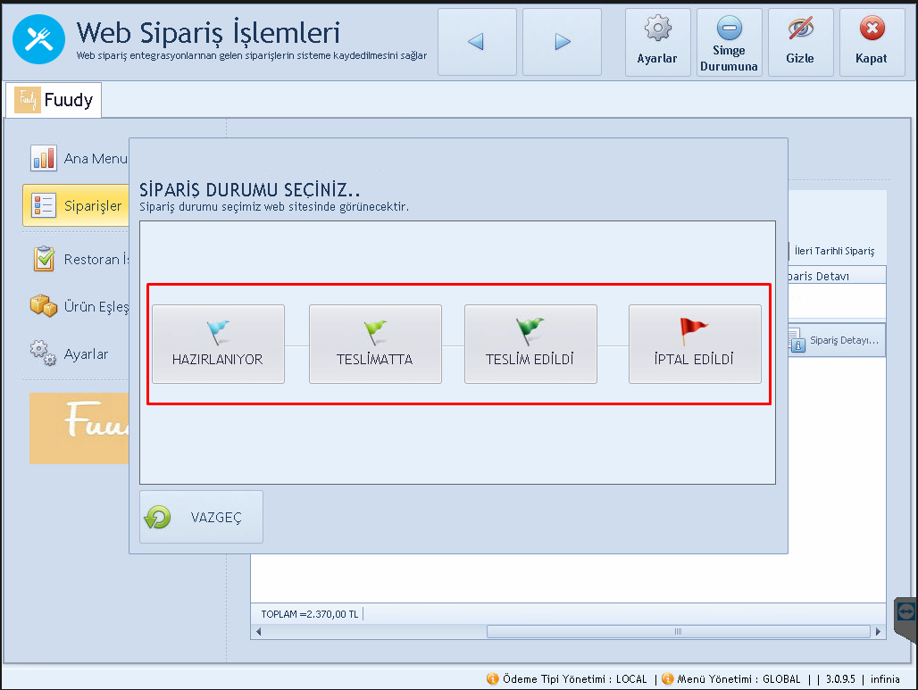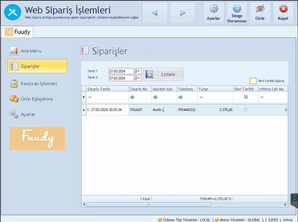 - Fuudy uygulamasından verilen siparişler direkt olarak Webintegrations uygulamamız içerisine düşecektir;