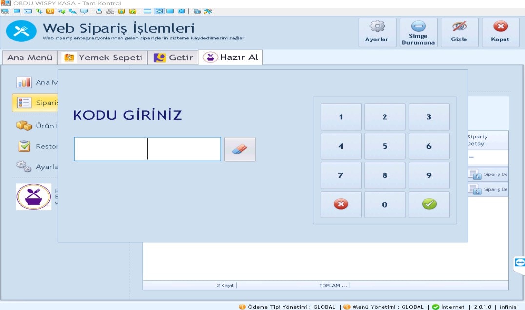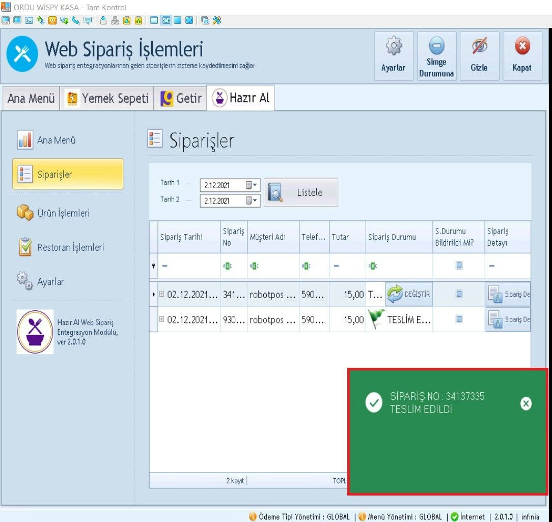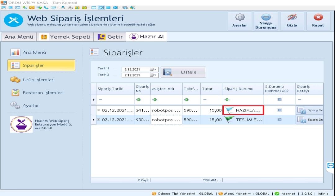 - Aşağıdaki ekranda hazır al butonuna basılarak siparişin detayı görüntülenir.