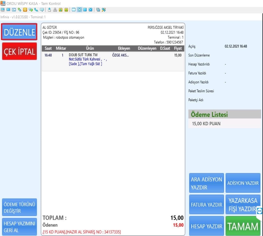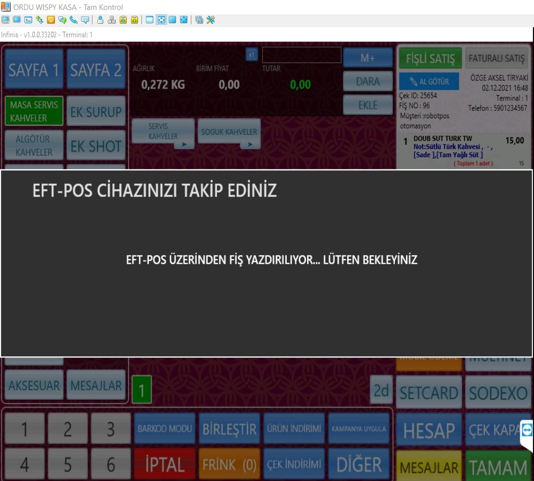 - Aşağıdaki ekran karşımıza geldiğinde ürünler yazıcıdan otomatik olarak çıkacak ve sipariş kaydı