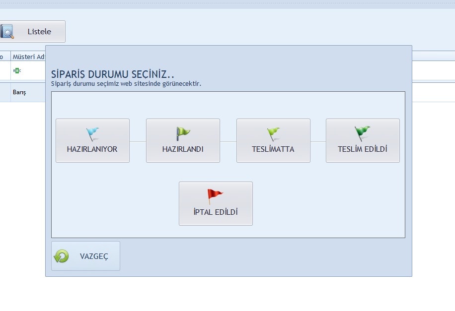 - Web sipariş tarafında entegrasyon uygulaması üzerinden siparişin statüsü ilerletilebilmekte ta da iptal edilebilmektedir.