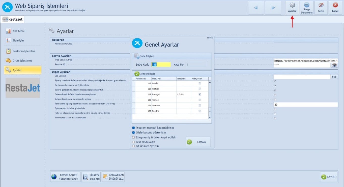 - Entegrasyon uygulaması üzerinden ayarlar butonuna girilir ve restajet entegrasyonu işaretlenerek aktif edilir.
