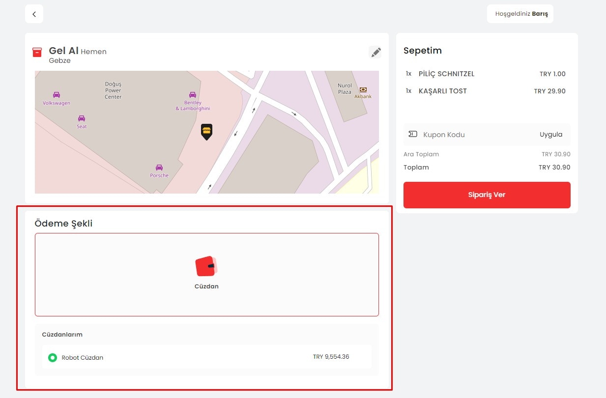- Restajet uygulaması üzerinden sipariş robotposa yönlendirilir.Bu alanda kişi dilerse online ödeme olarak kredi kartı seçeneğini seçebilir yada robotposta bulunan cüzdan bakiyesi ile ilerleyebilir.