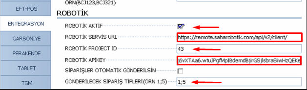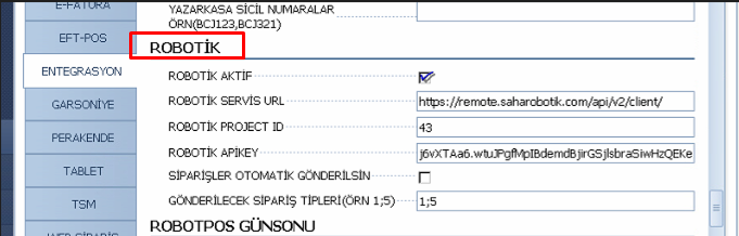 - Entegrasyon alanına giriş yapıldıktan sonra aşağıda bulunan ROBOTİK başlığının olduğu alanların bilgileri doldurulur.Bu alanda doldurulması gereken bilgiler robotpos yazılım biriminden alınmaktadır.