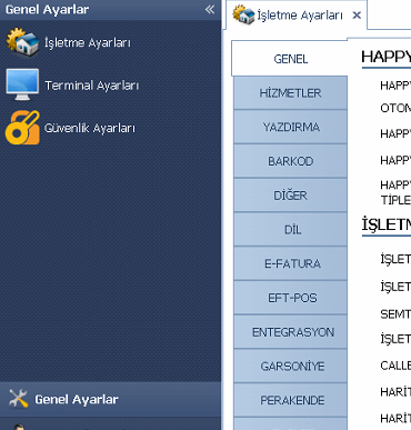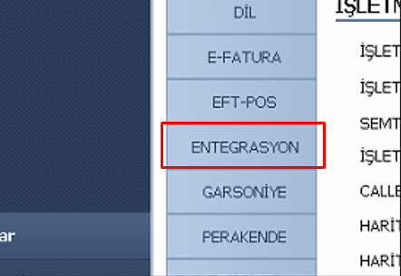 - İşletme ayarı ekranından Genel butonu içerisinde ENTEGRASYON alanına tıklanır.