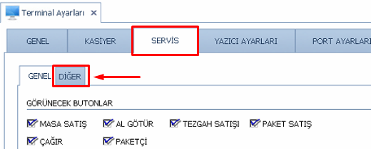 - Terminal ayalarına giriş sağlanır. Açılan sekmede SERVİS butonuna tıklanır ve açılan sayfada DİĞER butonuna giriş sağlanır.