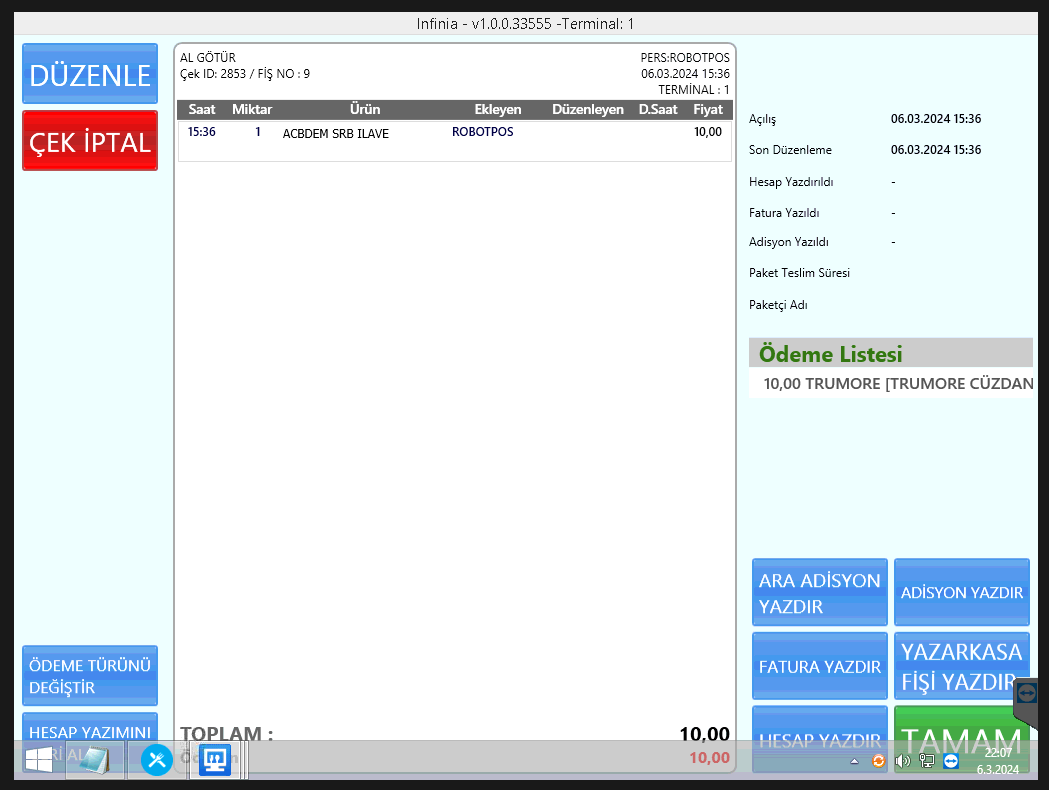 - Ödeme işlemi mobil uygulama üzerinden onaylandıktan sonra oluşturulan adisyon başarılı bir şekilde kapatılır.