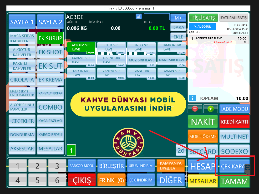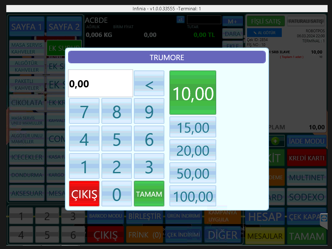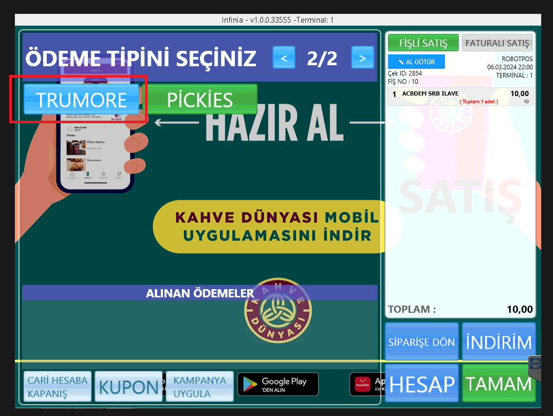 - Çek Kapat butonu tuşlanarak “Ödeme Tipi Seçiniz” penceresinde TRUMORE ödeme tipi tuşlanır,