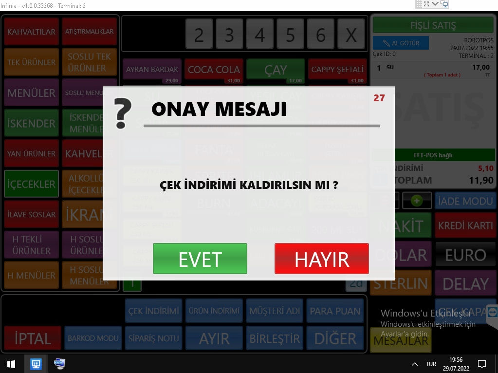 - İndirimi iptal etmek için Çek indirimi butonu tuşlanır ardından açılan pencerede