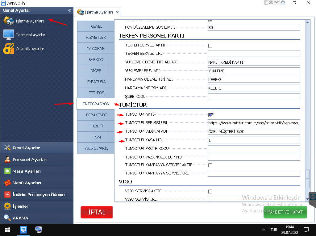- İşletme Ayarları>Entegrasyon>Tumictur başlığı altında görselde de belirtilen