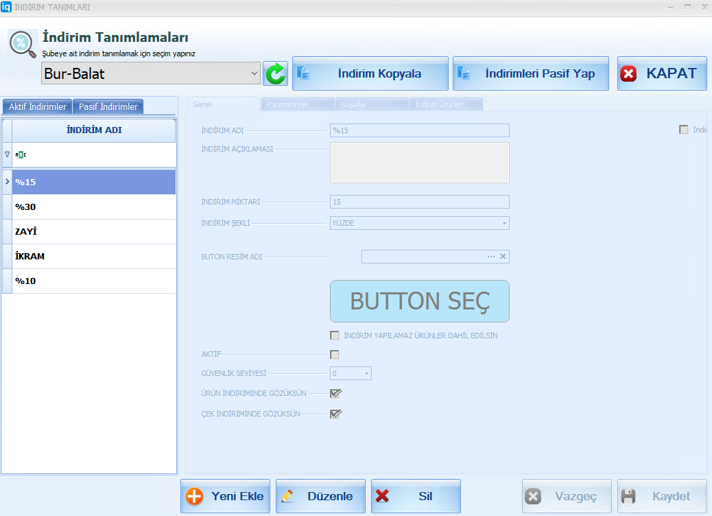 - Ekranın sol tarafında Aktif İndirimler ve Pasif İndirimler olmak üzere iki sekme bulunur. Bu sekmeler üzerinden seçili olan şubenin aktif veya pasif durumdaki indirim tiplerini görüntüleyebilirsiniz.