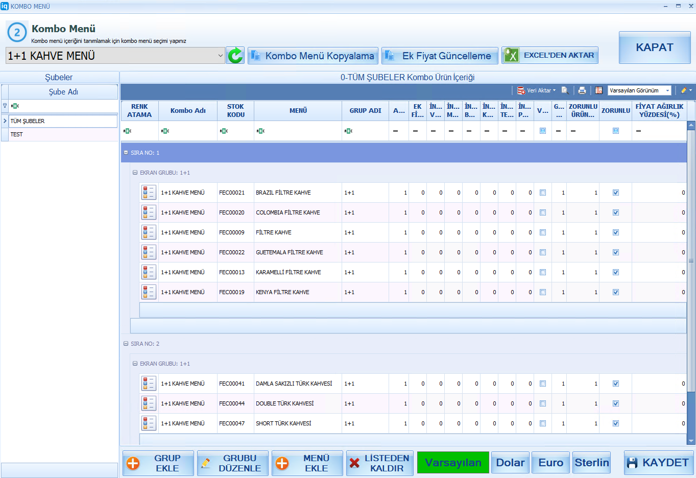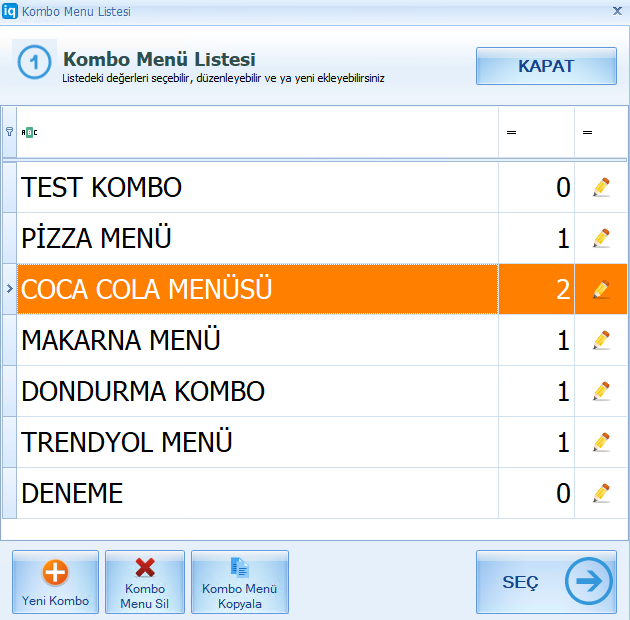 - Modüle girdiğinizde, şablon ekranına benzer bir kombo menü ekranı ile karşılaşırsınız. Bu ekran, tüm kombo menülerinizi yönetebileceğiniz merkezi bir yerdir.