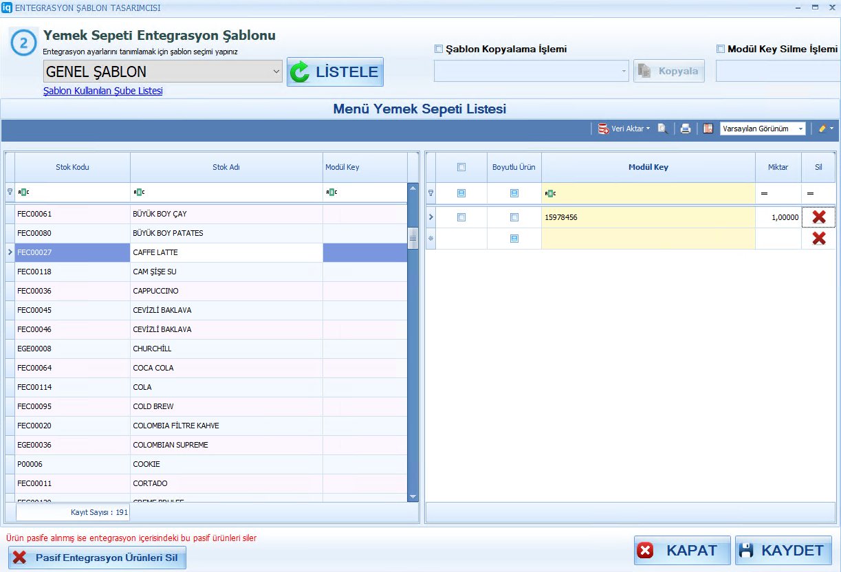 - Yeni Şablon Ekle Butonu: Bu buton, yeni fiyat şablonları oluşturmanıza olanak tanır. Yeni tanımladığınız şablon içinde sistemde aktif olan tüm menü listesini görebilir ve fiyatlandırılması gereken ürünlere satış tipine göre fiyat tanımlaması yapabilirsiniz.