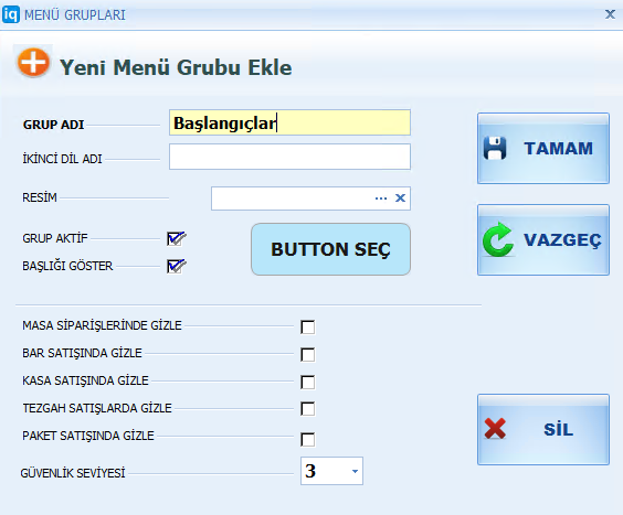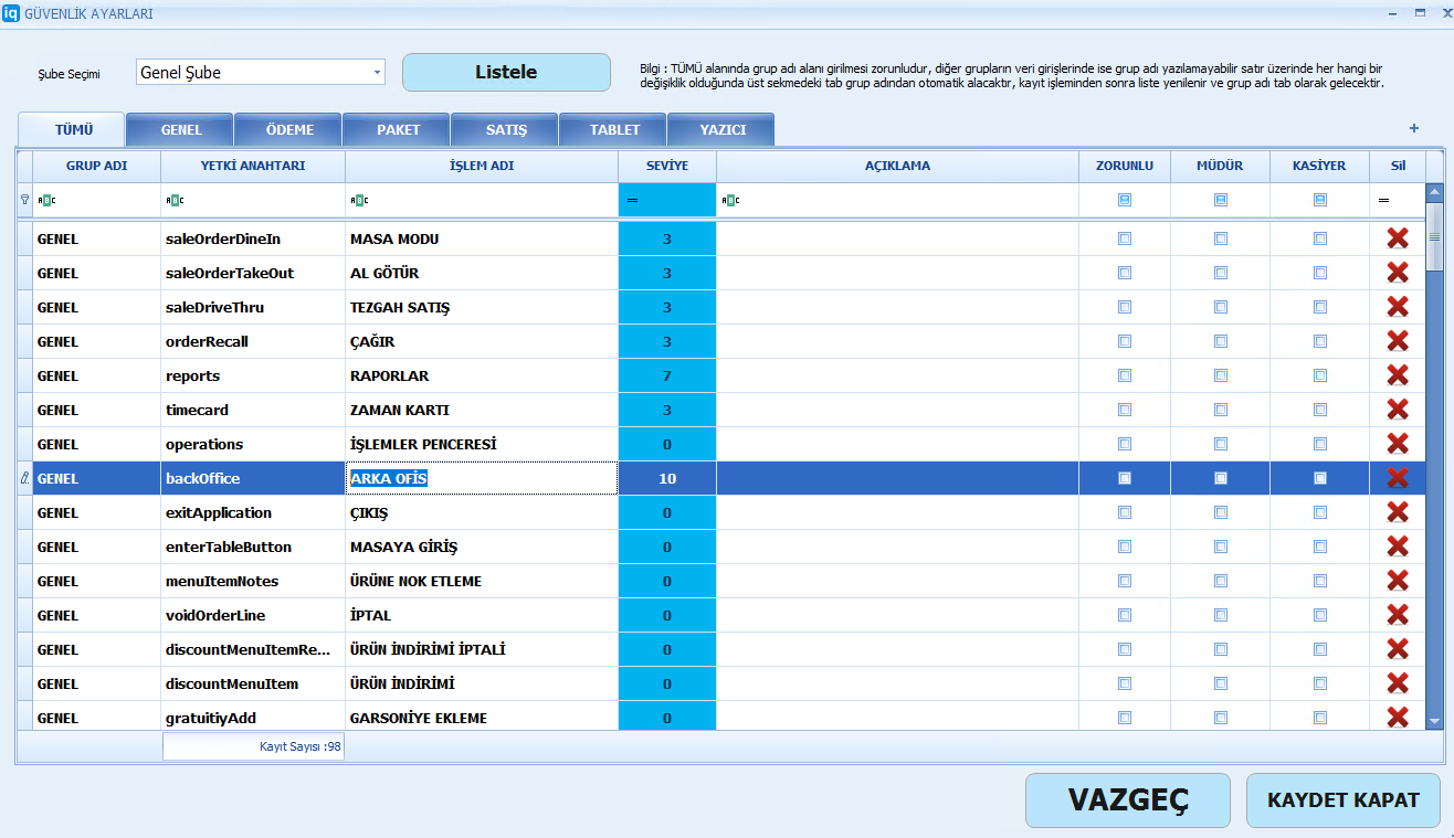- Sistemde, farklı kullanıcı rolleri için standart güvenlik seviyeleri tanımlıdır. Örneğin, garson kullanıcıları için varsayılan güvenlik seviyesi “3” olarak, kasiyer kullanıcıları için ise “7” olarak atanmıştır.