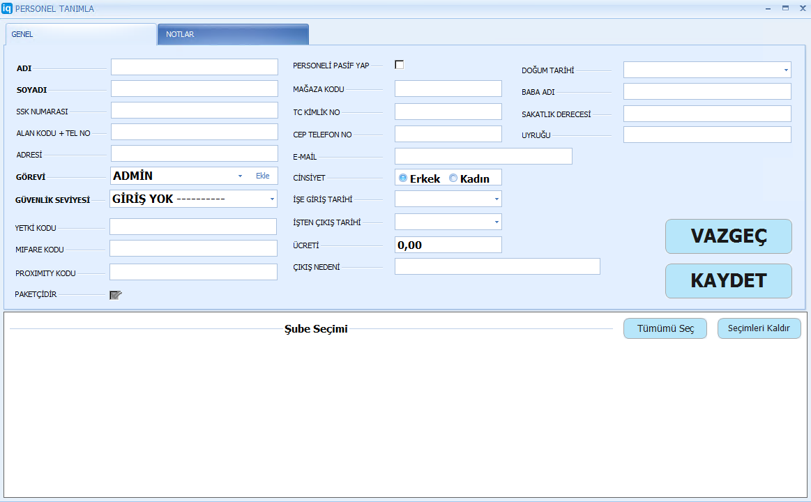 - Sol taraftan, tanımlama yapmak istediğiniz şubeyi seçin. Eğer personel tüm şubelerde görev alacaksa “Tüm Şubeler” seçeneğini işaretleyin.