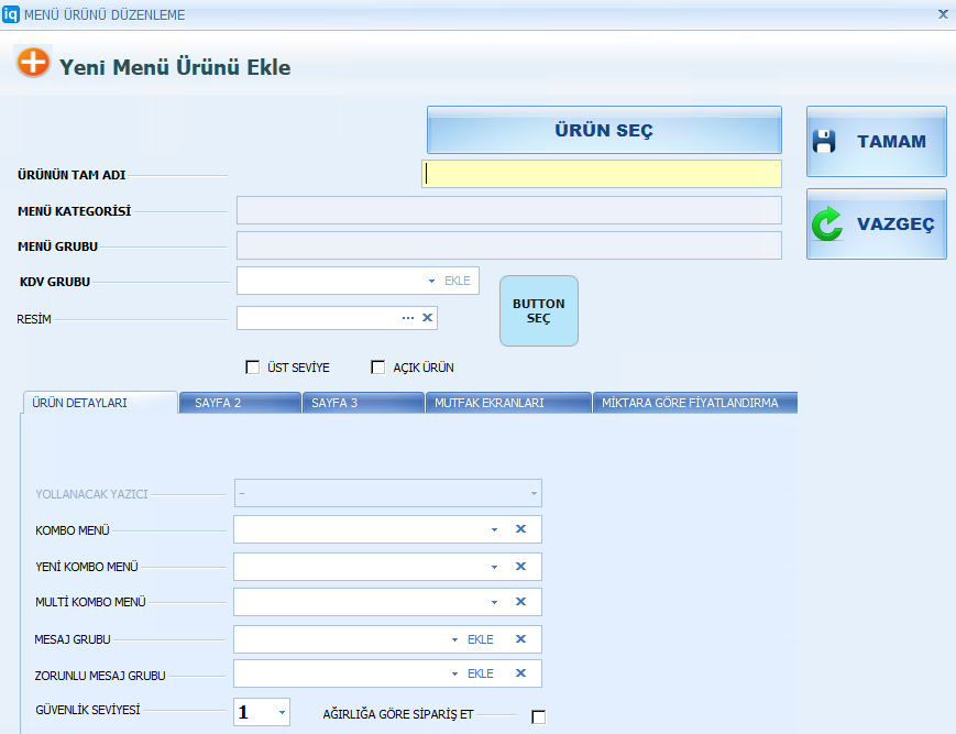 - Örneğin, Türk Kahvesi grubu için mutfak tarafına gönderilecek mesajlar olarak “Sade,” “Orta,” ve “Şekerli” gibi seçenekler tanımlanabilir.