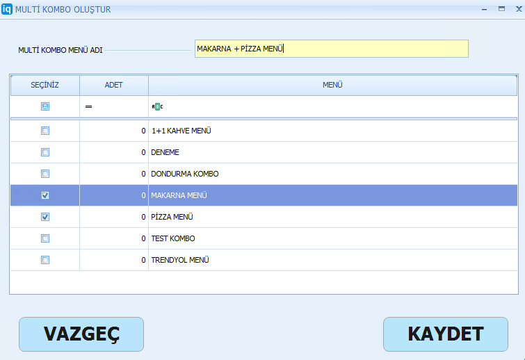 - Bu liste, mevcut kombo menülerinizi gösterir ve hangi menüleri multi komboya dahil etmek istediğinizi seçmenize olanak tanır.