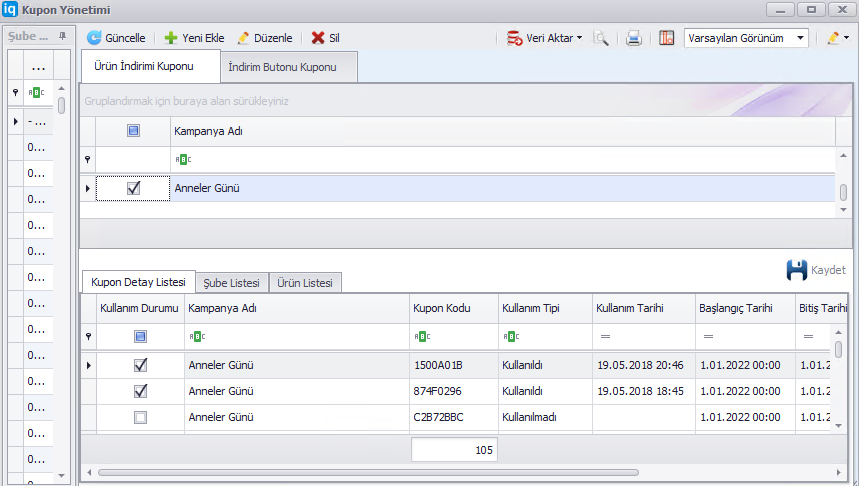 - 100 Adet Kupon Tanımlaması: Örneğin, 100 adet kupon kodu oluşturabilirsiniz. Bu kupon kodları, şube ekranında özel olarak tanımlanan bir menü butonuna bağlanır.