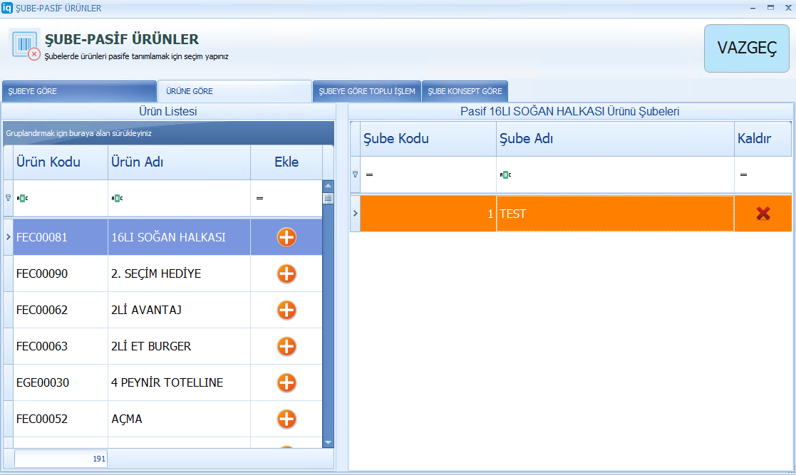 Örneğin, 5 şubeli bir işletmeniz var ve tüm şubeleriniz aynı Genel Şablon’u kullanıyor. Ancak, bu şubelerden biri için özel bir kampanya tanımlaması yapmak istemiyorsunuz ve bu nedenle ana menüde yer alan belirli bir butonun o şubede görünmesini engellemek istiyorsunuz. Şube Pasif Ürünler modülü tam da bu noktada devreye girer.