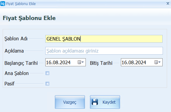 - Yeni Şablon Ekle Butonuna Tıklayın: Fiyat yönetimi ekranında, yeni bir şablon oluşturmak için “Yeni Şablon Ekle” butonuna tıklayın.