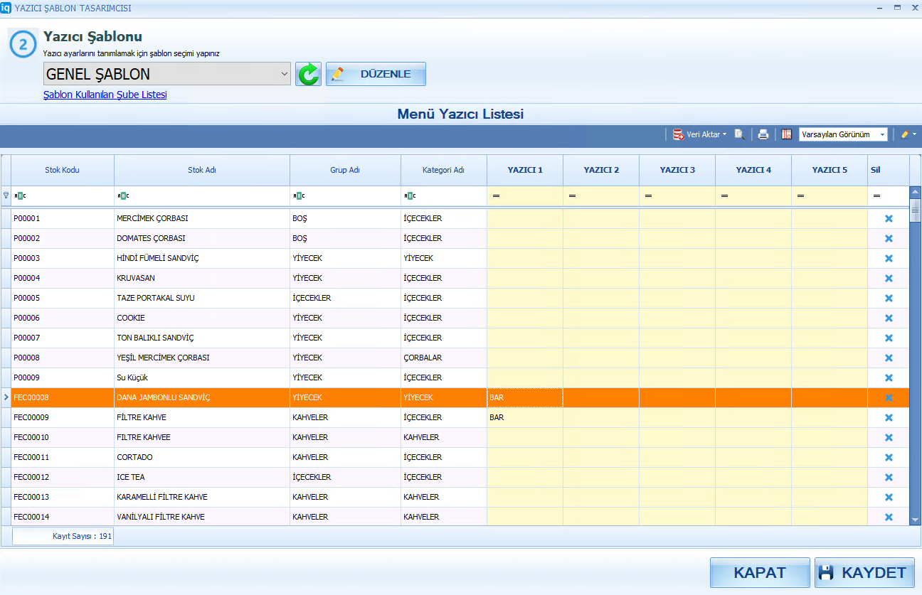 - Örnek Kullanım: Örneğin, DANA JAMBONLU SANDVİÇ ve FİLTRE KAHVE ürünleri, “BAR” olarak tanımlanmış bir yazıcı ayarına gönderilecek şekilde yapılandırılmıştır. Bu ürünler, belirlediğiniz yazıcı ayarlarına uygun olarak çıktılarının alınacağı yazıcıya yönlendirilir.