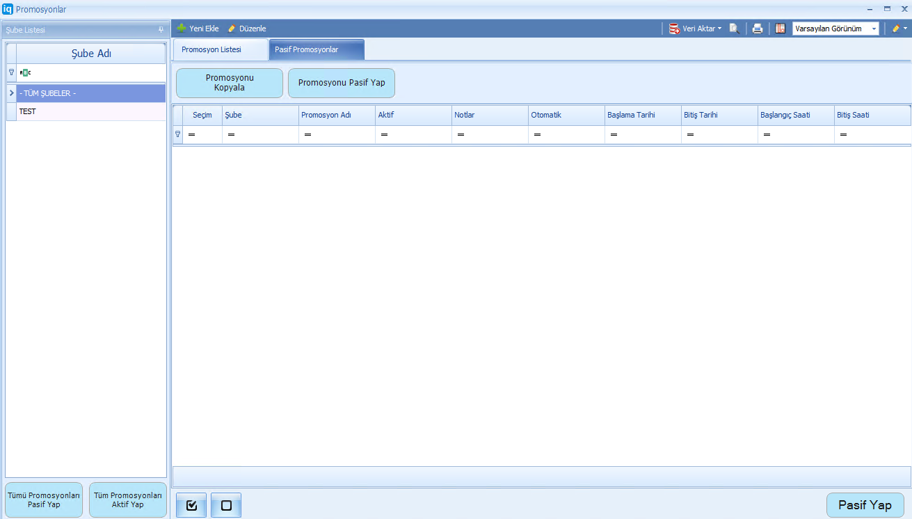- İndirim Yönetimi modülüne giriş yapın. Giriş yaptıktan sonra, ekranın üst kısmında şube seçimi yapabileceğiniz bir alan, indirimleri kopyalayabileceğiniz bir seçenek ve indirimleri toplu olarak pasife alabileceğiniz bir buton göreceksiniz.