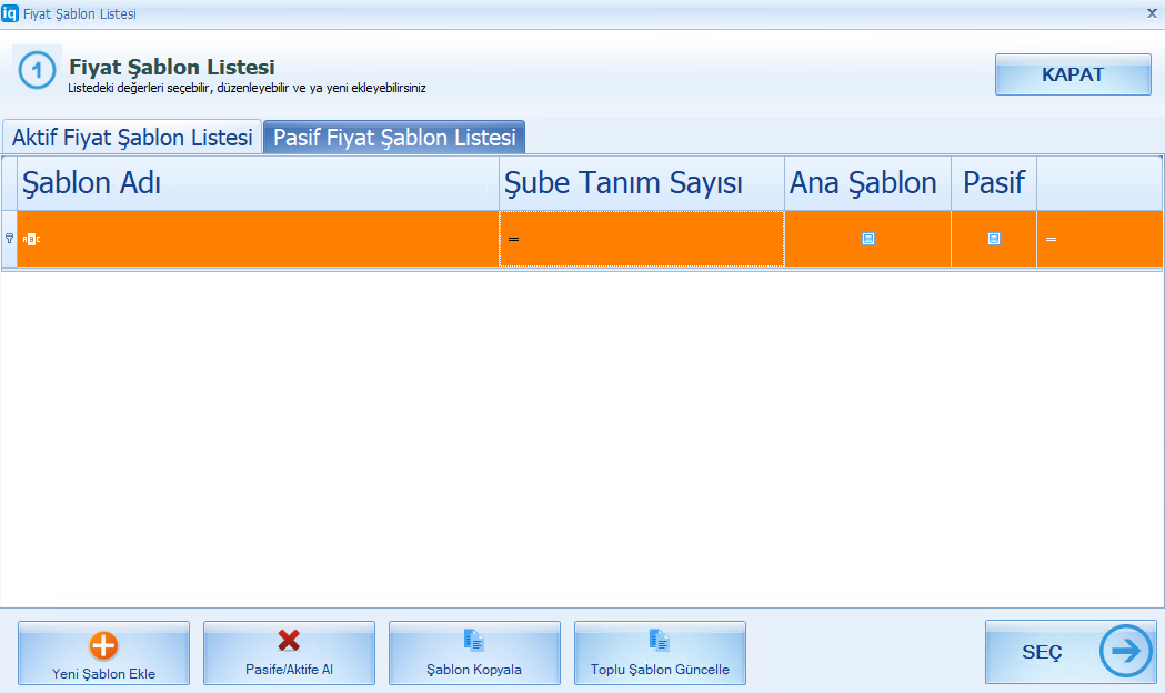 - Pasife/Aktife Al Butonu: Bu buton, daha önce kullanılmış ancak artık aktif olmayan fiyat şablonlarını pasife almanızı veya pasife alınmış şablonları tekrar aktif hale getirmenizi sağlar. Bu sayede, kullanmadığınız şablonları düzenleyebilir veya eski şablonları tekrar devreye alabilirsiniz.