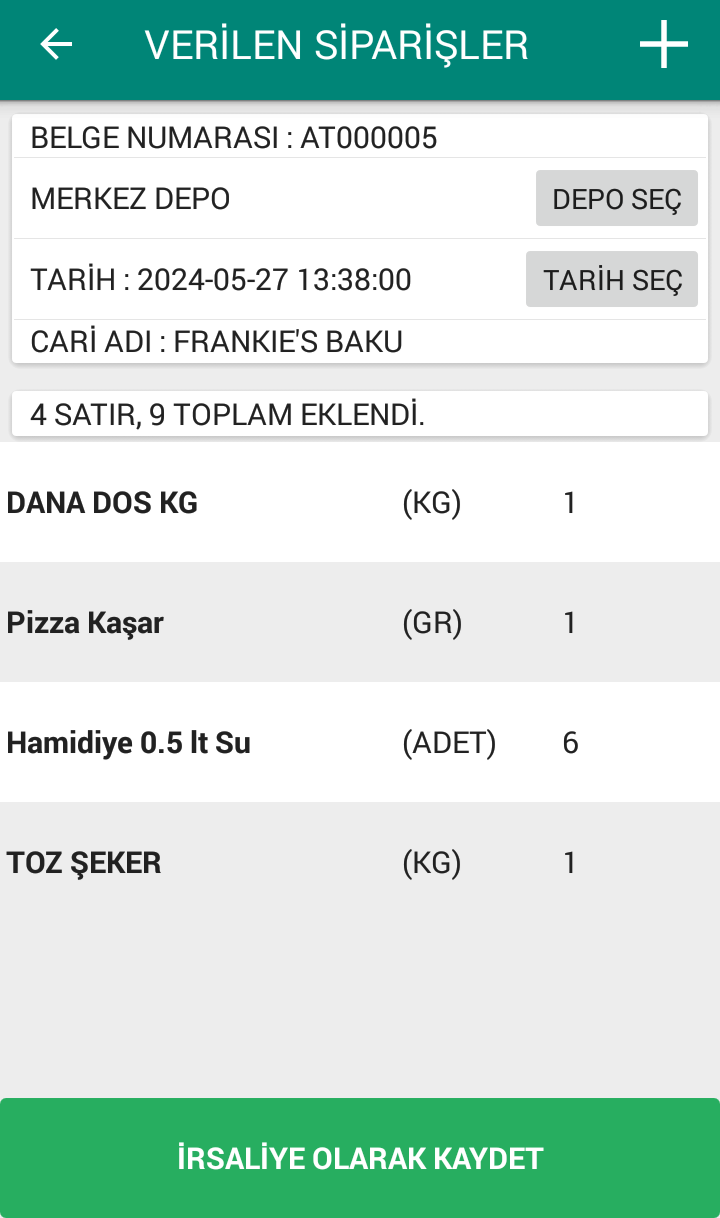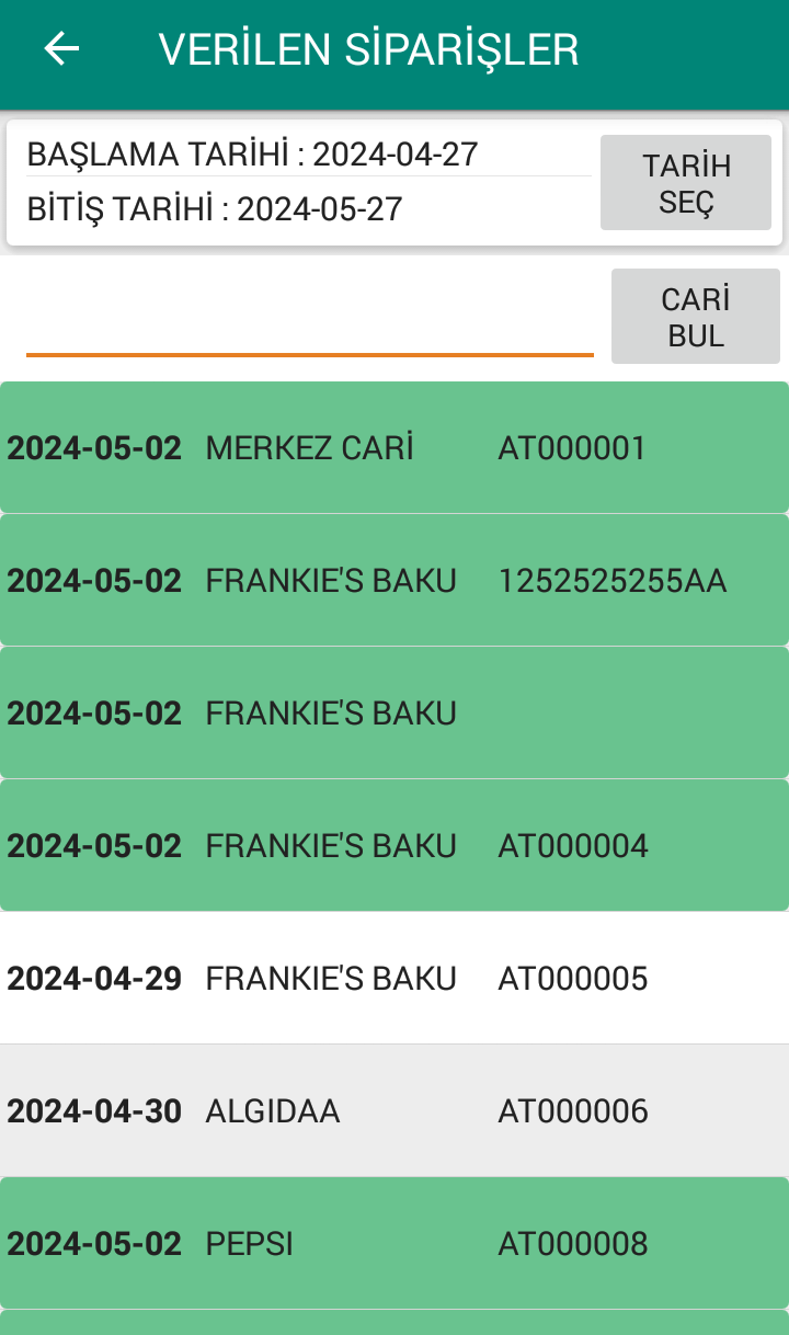 Ana menüden “Verilen Siparişler” sekmesine giriş yaptığınızda, tüm verilen siparişleri detaylı bir şekilde görüntüleyebilirsiniz. Bu ekranda, tarih filtresi uygulayarak belirli tarihler arasındaki siparişleri de inceleme imkanına sahipsiniz. İlgili bir siparişin üzerine tıkladığınızda, o siparişin içeriğini ayrıntılı olarak görüntüleyebilir ve ürün miktarlarına ilişkin bilgileri detaylı şekilde gözlemleyebilirsiniz.
