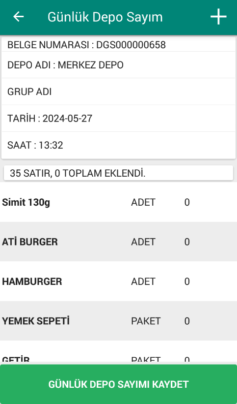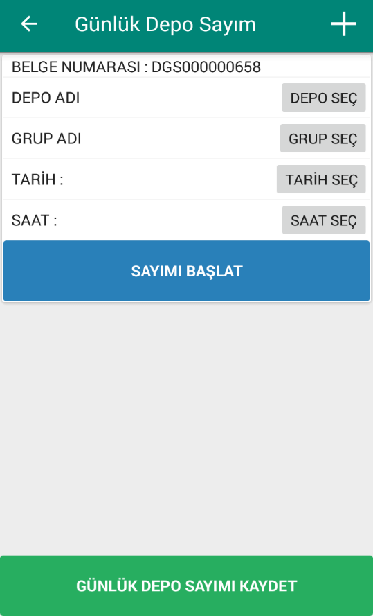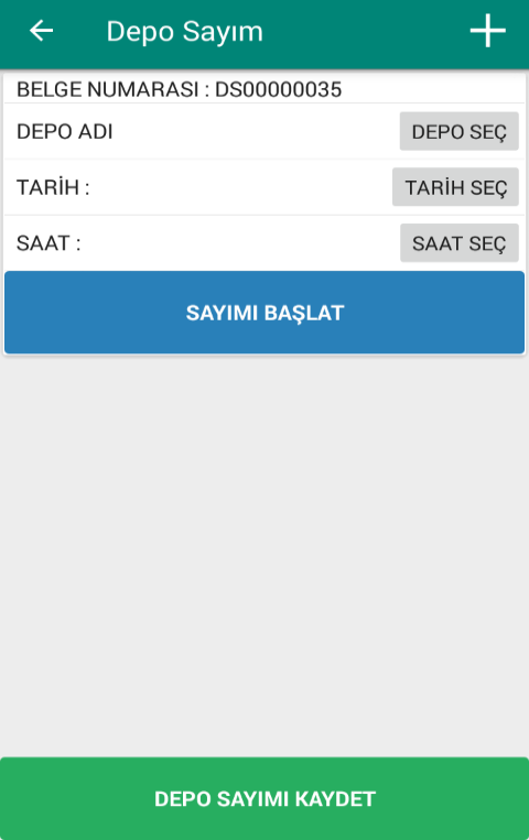 Yeni bir sayım girişi yapmak için sağ üst tarafta bulunan artı seçeneğine basıyoruz. (Görsel6) Açılan pencerede öncelikli olarak depo, tarih ve sayım saatini seçiyoruz. Seçimlerimizi yaptıktan sonra sayımı başlat diyerek belgemizi oluşturuyoruz. (Görsel 7) Görsel 6; Görsel 7;