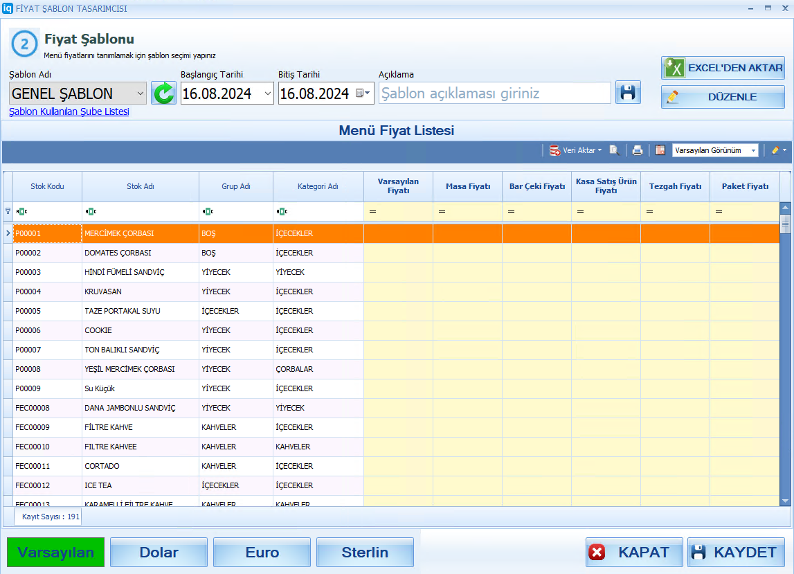 - Örneğin, tüm şubelerin aynı fiyat şablonunu kullanmasını istiyorsanız, bu modül üzerinden ilgili şablonu seçip tüm şubelere aynı anda uygulayabilirsiniz.