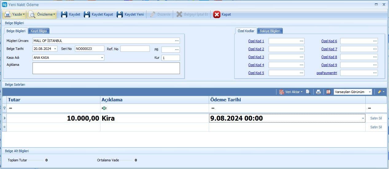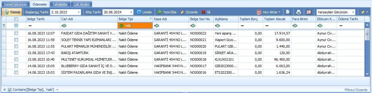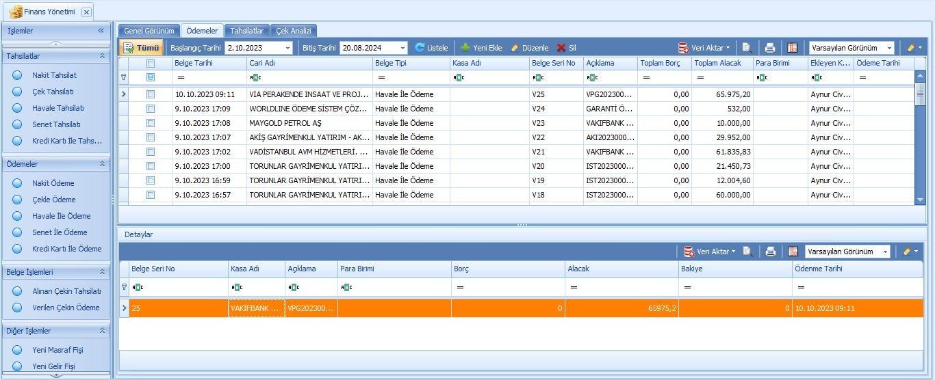 Üst Bölüm: Bu bölümde, ödeme, tahsilat ve çek fişleriniz listelenir.
