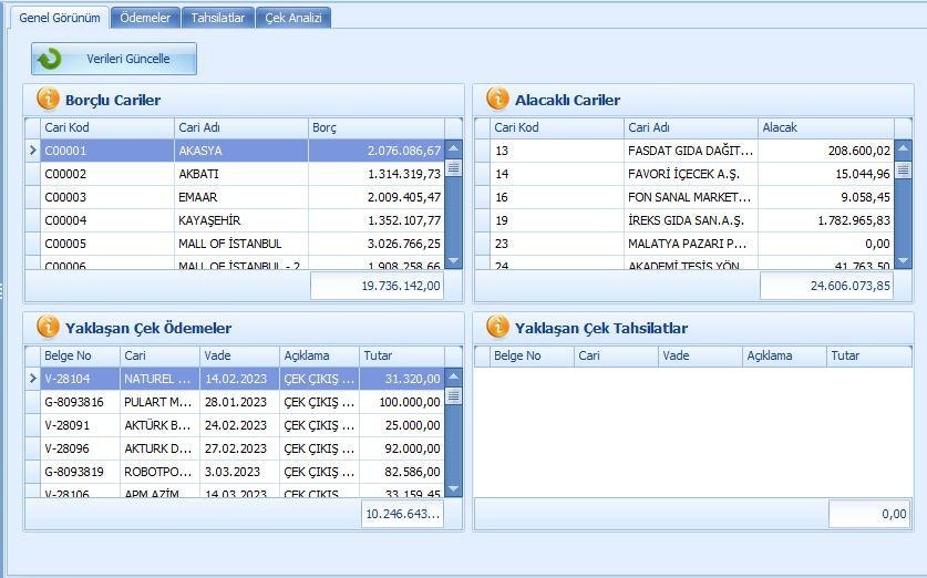 Alt Bölüm: Alt kısımda ise bu fişlerin detayları yer alır ve işlem yapmadan önce tüm detayları gözden geçirebilirsiniz. Ayrıca, genel görünüm başlığında borçlu ve alacaklı carilerinizi, yaklaşan çek ödemelerinizi ve tahsilatlarınızı ayrı paneller halinde görebilirsiniz.(Görsel 33) Görsel 33:
