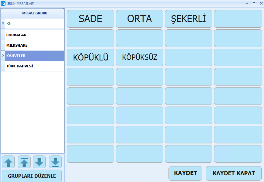 - Örneğin, Türk Kahvesi grubu için mutfak tarafına gönderilecek mesajlar olarak “Sade,” “Orta,” ve “Şekerli” gibi seçenekler tanımlanabilir.