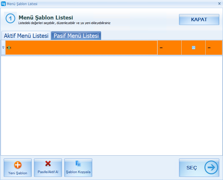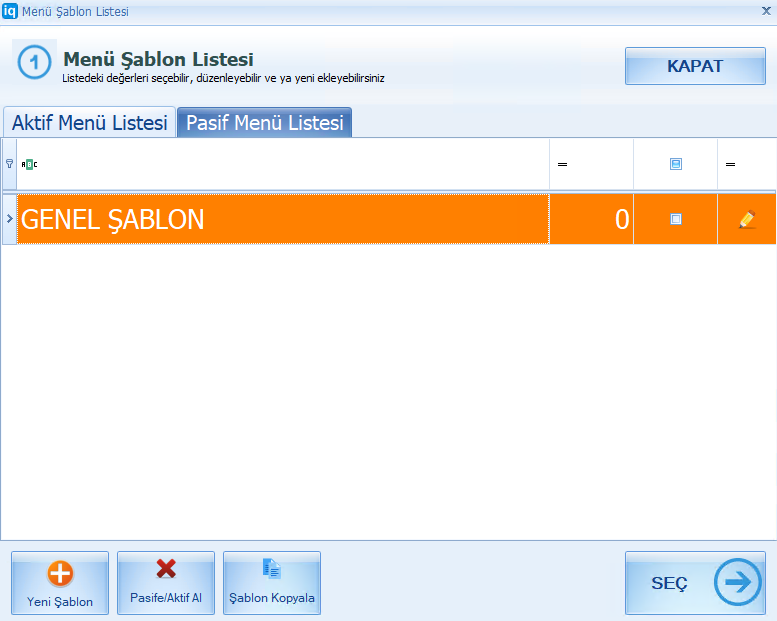 - Modüle girdiğinizde, şablon ekranına benzer bir kombo menü ekranı ile karşılaşırsınız. Bu ekran, tüm kombo menülerinizi yönetebileceğiniz merkezi bir yerdir.