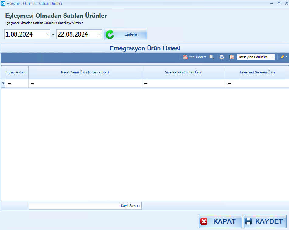 - Sisteme eşleşmemiş olarak düşen ürünleri bu ekranda görüntüleyebilir ve eşleşmesi gereken ürün alanından doğru ürün eşleştirmesini yapabilirsiniz. Bu işlem, hatalı ya da eksik entegrasyonların düzeltilmesi ve doğru ürünlerin sisteme yansımasını sağlar.