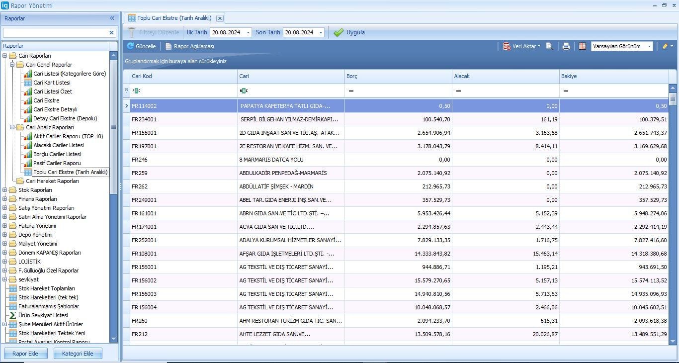 Raporlar Modülü, IQ ERP programındaki işlemlere dair rapor verilerini kontrol edebileceğiniz bir alandır. Bu modül, raporların geniş ekranda görüntülenmesini ve verilerin detaylı olarak incelenmesini sağlar. (Görsel 50) Görsel 50: