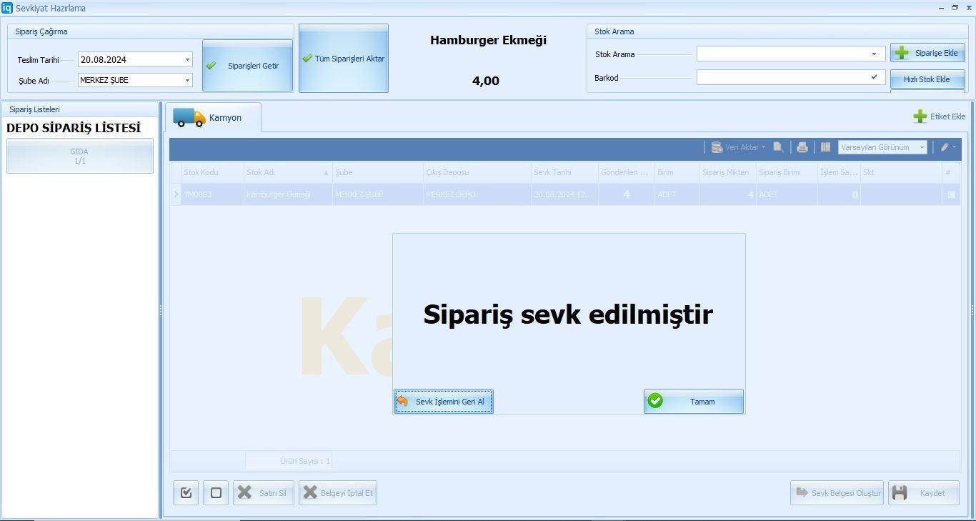 IQ ERP lojistik modülü, franchise ve şubelerin portal sipariş sistemimiz üzerinden merkeze olan ürün taleplerinin onay ve sevk sürecini yönetmek için kullanılmaktadır. Web portal sipariş sisteminden girilen siparişler, lojistik modülüne anlık olarak yansır ve onaylandıktan sonra sevk işlem sürecine alınır. Lojistik modülü üzerinden siparişlerin yazdırılması ve üretim haneye üretilecek ürün bilgisinin iletilmesi için gerekli raporlar da tedarik edilmektedir.2. Lojistik Modülü Arayüzü