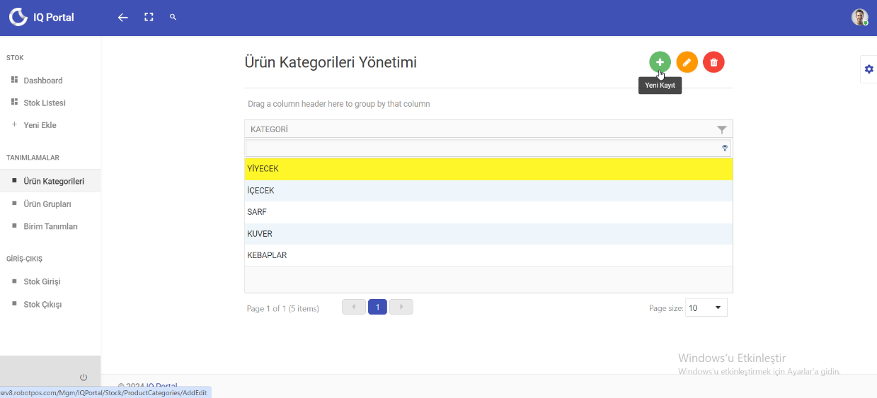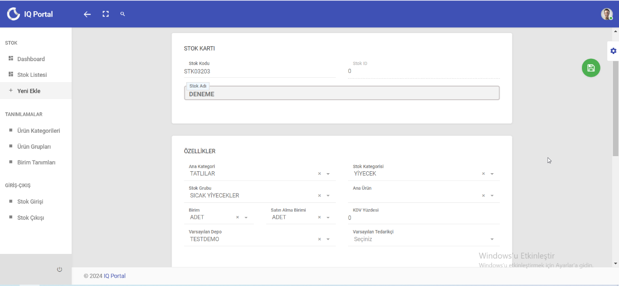 Stok modülüne tıklandıktan sonra açılan pencerede ‘Yeni Ekle’ alanına tıklanması gerekmekte olup, alt taraftaki görselde belirtilen alanların doldurulması gerekmektedir: Stok Adı, Ana Kategori, Stok Kategorisi, Stok Grubu, Birim, Varsayılan Depo, KDV Yüzdesi. (Görsel 8) Görsel 8: