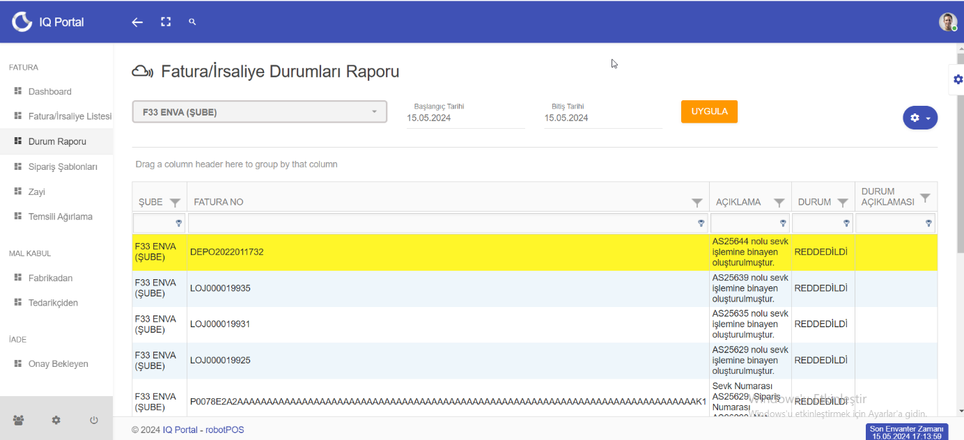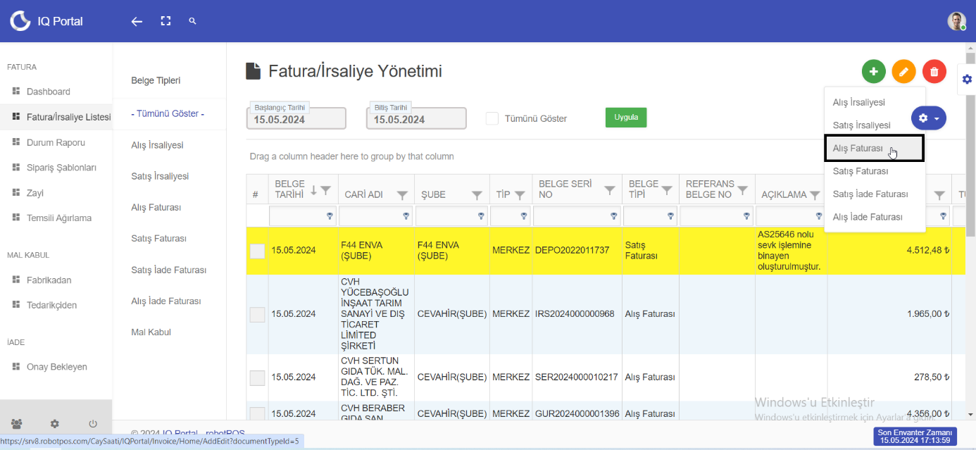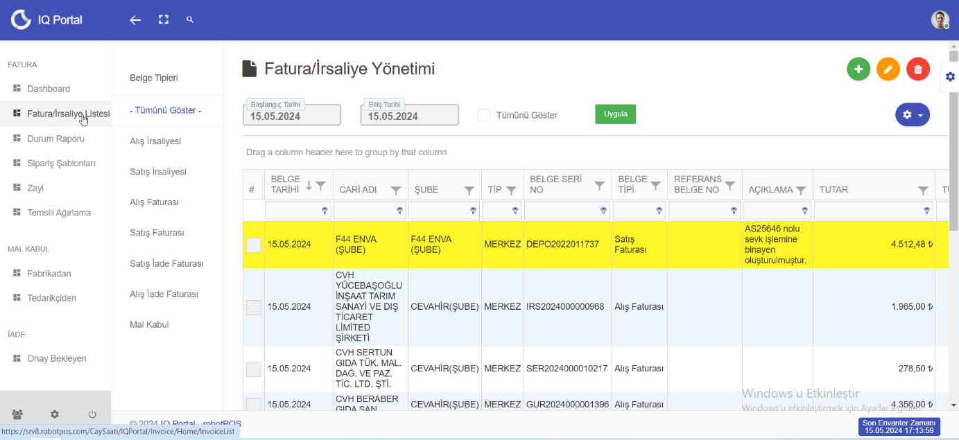 Sol taraftaki ‘Fatura/İrsaliye Listesi’ alanında, entegrasyon ile işletmeye aktarılmış belgeler ile panel üzerinden girilmiş olan faturalar yer almaktadır. (Görsel 3) (Görsel 4) Görsel 3: