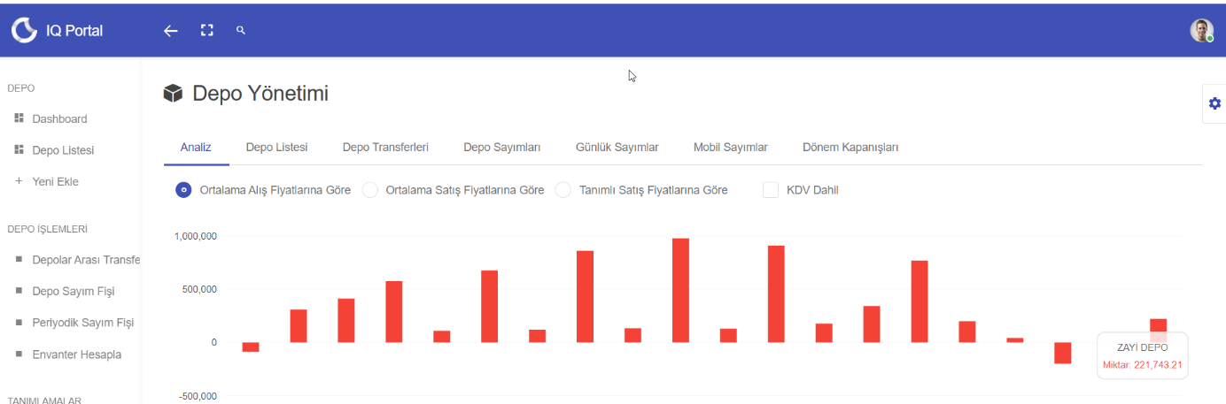 Depo Modülüne tıklandıktan sonra altta görselde belirtildiği gibi depo grafikleri gelmektedir. Bu görselde işletmeye ait deponun tutarsal karşılığı görüntülenmektedir. (Görsel 13) Görsel 13: