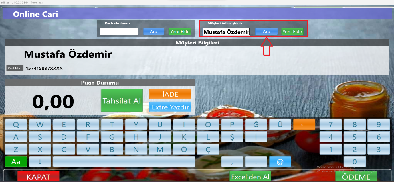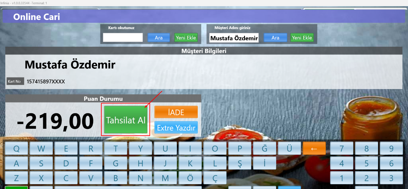 - Ardından gelen ekranda tahsilat yapılacak cari hesabın ismi veya kart numarası tuşlanır.