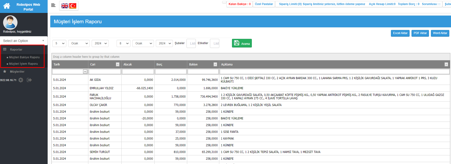 - Müşteriler sekmesinden ve raporlardaki müşteri bakiyeleri bölümünden bakiye kontrolü yapılabilir. Müşteri İşlem raporundan ise seçilen tarih aralığındaki tahsilat ve cari borç kapama işlemleri ayrıntılı görülebilmektedir.