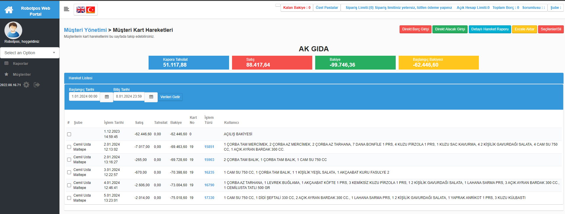 - Müşteriler listesinde müşteri seçilip sarı butona basıldığında açılan ekranda tarih filtresi yapılarak müşterinin hareketleri görüntülenmektedir.