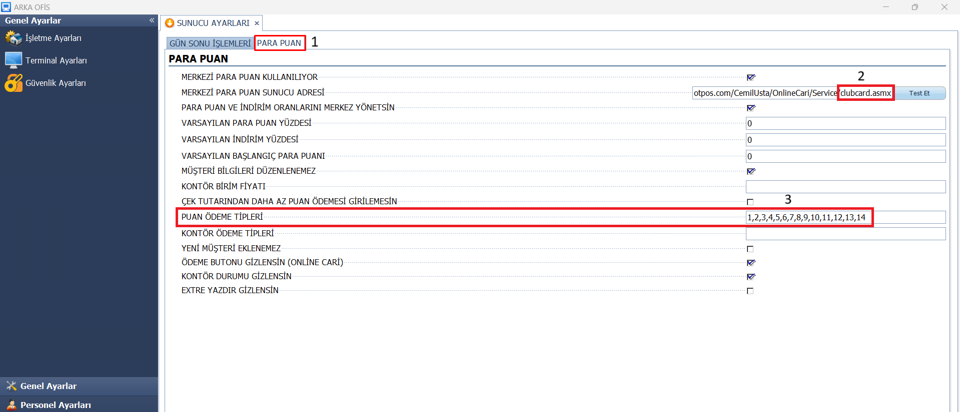 - Görselde işaretli olan 2. Kısımda yazılım tarafından iletilen “clubcard.asmx” ile biten URL “Merkezi Para Puan Sunucu Adresi” kısmına girilerek “Test Et” butonundan link kontrolü sağlanmalıdır.