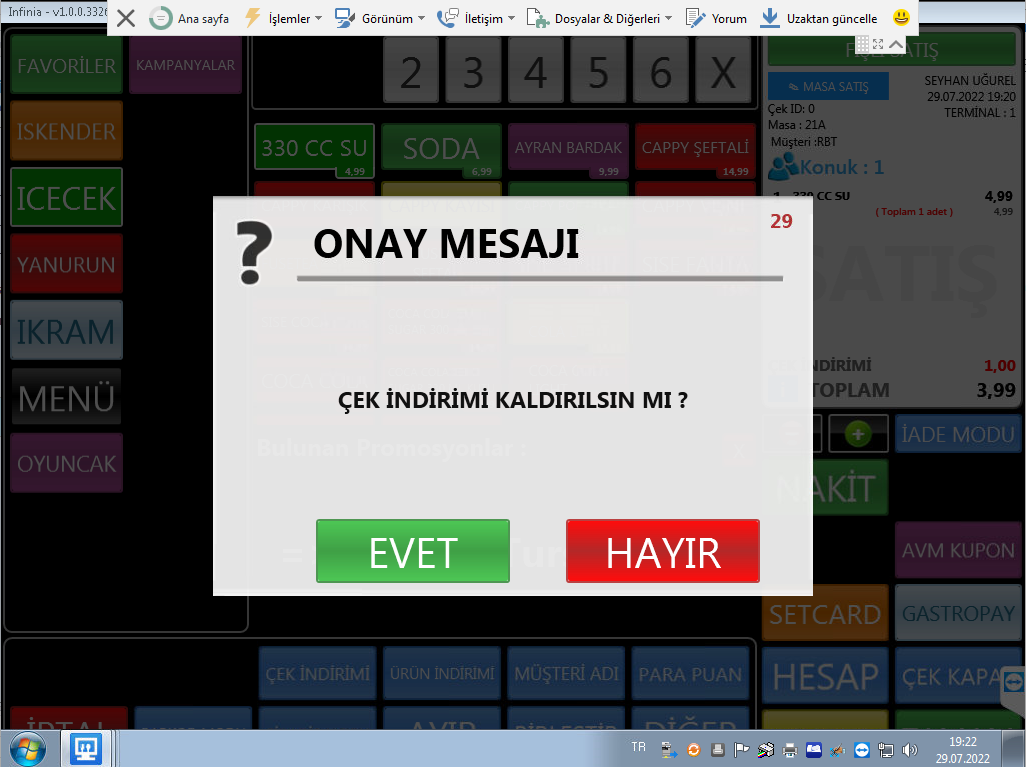 İndirim uygulandıktan sonra yapılan indirimi iptal etmek istediğimizde tekrar Çek İndirimi butonu tuşlanır çıkan uyarı ekranında “EVET” butonu tuşlanarak iptal sağlanabilir;