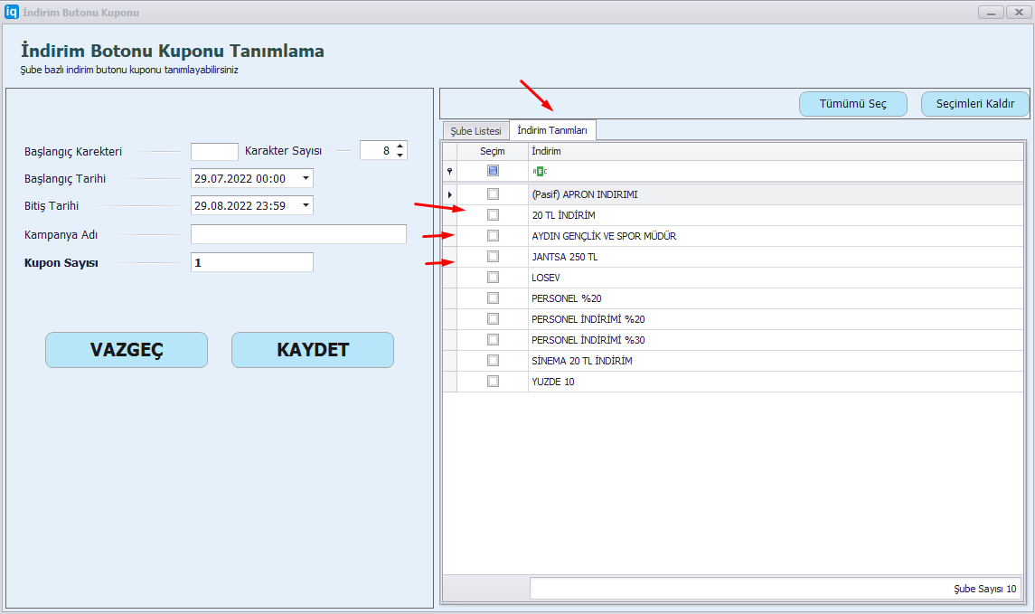 Çek oluşturulduktan sonra Çek indirimi butonu tuşlanarak ilgili indirim seçilip kupon kodu girilmekte girilen kupon kodu daha önce merkezi yönetim tarafında oluşturduğumuz kupon kodları ile karşılaştırılmaktadır;
