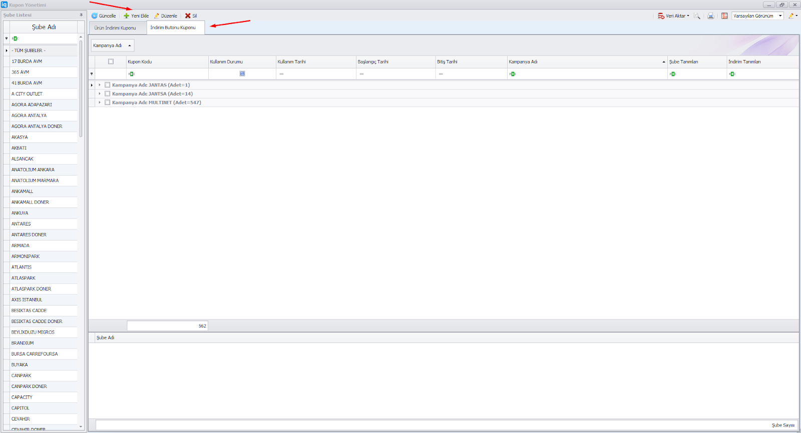 Kupon Yönetim panelinde İndirim Butonu Kuponu sekmesine geçtikten sonra Yeni ekle butonu tuşlanır;